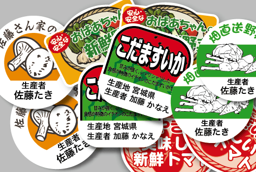 地域の新鮮で旬な商品を紹介する!産地・生産者がわかるシールで、安心で安全な食品である事をアピールできます。独自のシールで生産者をアピールする事でリピーターをゲット!販促につながります。多様な使用用途に応じたデザインをご提案致します。